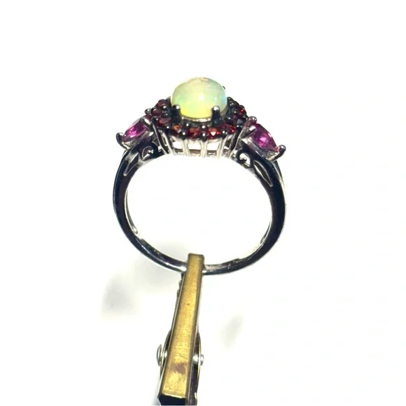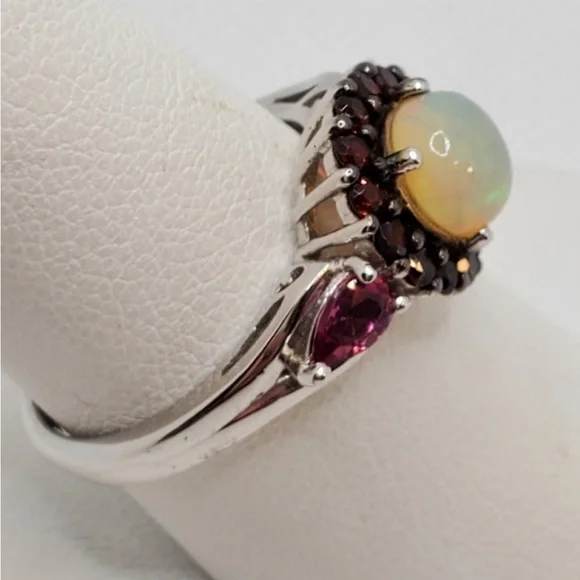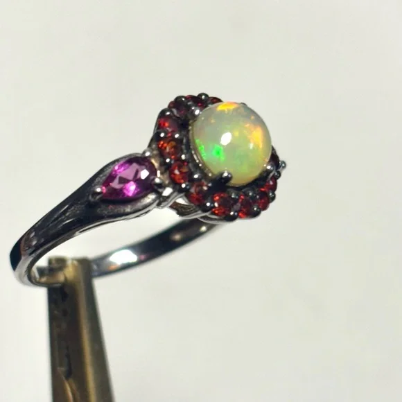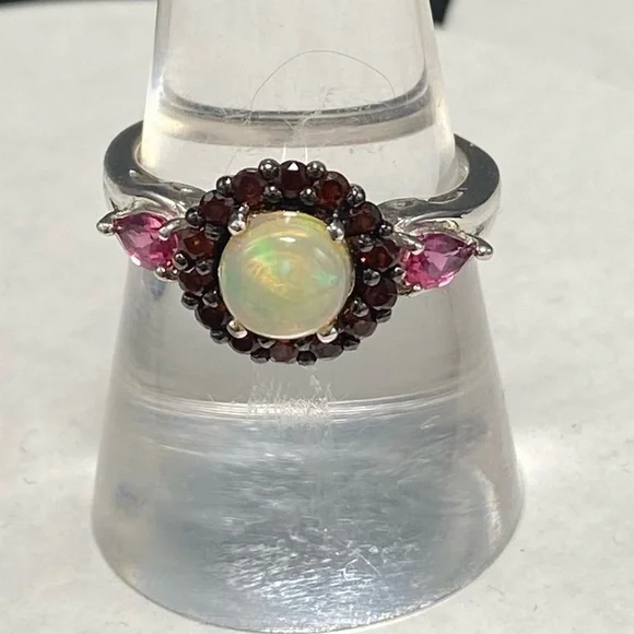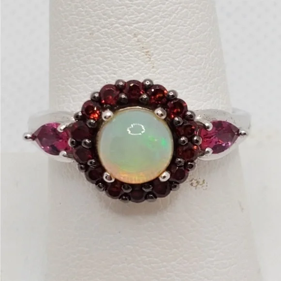Sterling Silver .95 Opal Garnet ring 9Stones are lab created Pretty ring Round opal opalescent round stone surrounded with garnet stones in a heavy vintage style raised setting with side stones Vintage jewelry sterling silver gemstone ring October birthstone but opals are universally gorgeous and popular Be yourself love yourself Wear vintage Free shipping unless it’s reduced below reserve Retail $298Renaissance Victorian Style Classic Vintage Silver sterling diamond gemstone antique gold Opal Jewelry